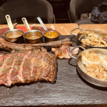 Grilled Australian Black Angus Beef 150 day grain fed Tomahawk A3 or Australian Wagyu 21 dry aged (600 – 1700g): 355 / 450 THB per 100g