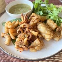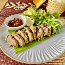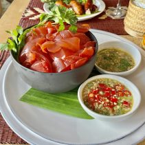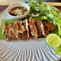 The menu at Ging Grai expands four regions, with family recipes rarely found in other regional restaurants and the use of young grai tree leaves, a seasonable local vegetable called pak lieb in central region, pak huerd in the North, and pak hierd in Isan. The signature dishes from Isan cuisine also are unique ones like tum sua (spicy papaya salad with fermented rice noodle), gaeng om gai (spicy chicken thick soup), and larb pla tong (Chitala fish larb). Savory dishes from central region are kanom jeen sao nam (fermented rice noodle with coconut sauce), sikrong moo tod nampla (fried baby spareribs with fish sauce), and goong kratiem pad kai khem (stir-fried shrimps with garlic and salted egg). Not-easy-to-find eastern dishes like maeng krapoon nampla whan (jelly fish with sweet fish sauce), yum pla.