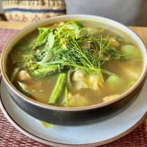 The menu at Ging Grai expands four regions, with family recipes rarely found in other regional restaurants and the use of young grai tree leaves, a seasonable local vegetable called pak lieb in central region, pak huerd in the North, and pak hierd in Isan. The signature dishes from Isan cuisine also are unique ones like tum sua (spicy papaya salad with fermented rice noodle), gaeng om gai (spicy chicken thick soup), and larb pla tong (Chitala fish larb). Savory dishes from central region are kanom jeen sao nam (fermented rice noodle with coconut sauce), sikrong moo tod nampla (fried baby spareribs with fish sauce), and goong kratiem pad kai khem (stir-fried shrimps with garlic and salted egg). Not-easy-to-find eastern dishes like maeng krapoon nampla whan (jelly fish with sweet fish sauce), yum pla.