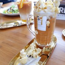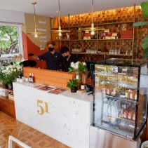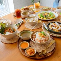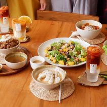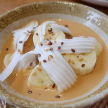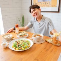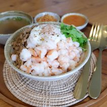 Examples from the menu include Sausage omelette with rice 75 THB + shrimp 88 THB / Stir fried chicken curry with egg 75 THB or shrimp 95 THB / shrimp + pork + egg + soup 105 THB / chicken breast and peach salad 165 THB / roti 65 THB / Thai Tea 75 THB / Thai Tea almond milk 85 THB / Thai Tea with grass Jelly 95 THB and much more besides…