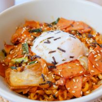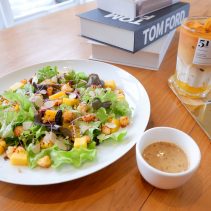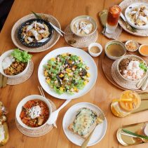 Examples from the menu include Sausage omelette with rice 75 THB + shrimp 88 THB / Stir fried chicken curry with egg 75 THB or shrimp 95 THB / shrimp + pork + egg + soup 105 THB / chicken breast and peach salad 165 THB / roti 65 THB / Thai Tea 75 THB / Thai Tea almond milk 85 THB / Thai Tea with grass Jelly 95 THB and much more besides…