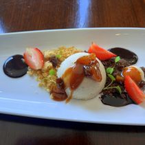 Porcini mousse: Chestnut & porcini mushrooms mousse, caramelized raisin, chocolate sauce 190 THB