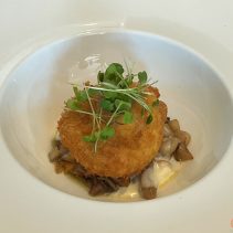 Uovo croccate ai funghi: Crispy bread crusted soft boiled egg, warm Italian “Toma” cheese mousse, Sautéed mixed mushrooms, walnuts pesto sauce, apple compote 320 THB