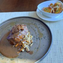 Filetto ai funghi: Char grilled Australian Black Angus beef tenderloin (180g), Sautéed Italian mushrooms, sautéed baby potato with pancetta bacon, morel & black truffle sauce 1400 THB