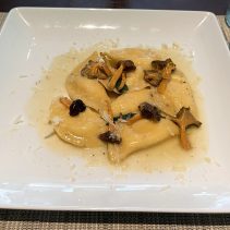 Ravioli finferli e Burrata: Handmade ravioli with Burrata cheese, sautéed chanterelle mushrooms, Sage butter & parmesan cheese sauce 440 THB