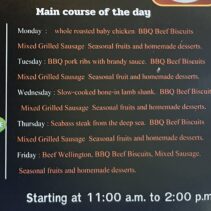 Open Monday – Friday from 11am until 2pm. Different menu’s each day: highlights this week Monday: whole roasted baby chicken / Tuesday: BBQ pork ribs with brandy sauce / Wednesday: slow –cooked bone-in lamb shank / Thursday: Seabass steak from the deep sea / Friday: Beef Wellington