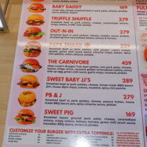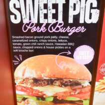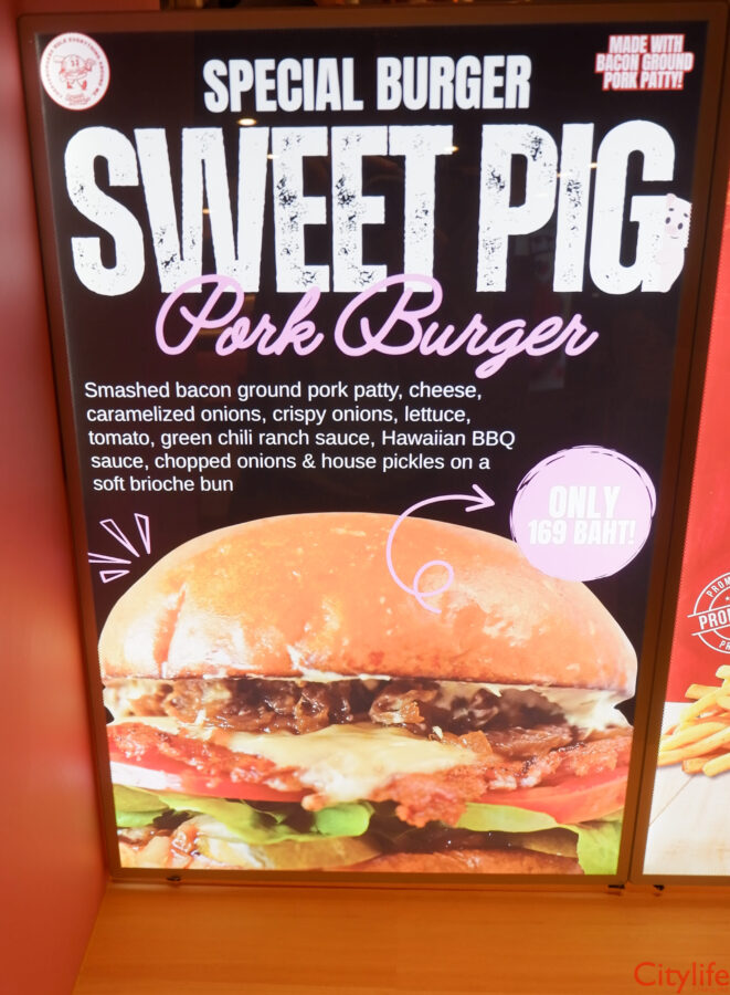 Sweet Pig Pork Burger: smashed bacon ground pork patty, cheese, caramelized onions, crispy onions, lettuce, tomato. Green chili ranch sauce, Hawaiian BBQ sauce, chopped onions & house pickles on a soft brioche bun 169 THB – only available at Central Plaza Chiang Mai Airport Branch.
