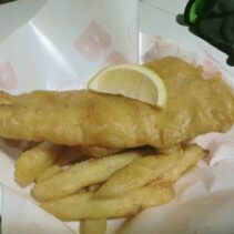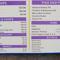 Examples from the menu include: Fish & Chips (small) 250 THB / Fish & Chips (large) 295 THB / Cod & Chips 325 THB / Haddock & Chips Very Large Filet 395 THB / 3 Fish Fingers & Chips 195 THB / Battered Sausage 95 THB / Saveloy 95 THB and lots more on the menu such as mushy peas, curry sauce, pickled egg, pickled onion and much more besides…