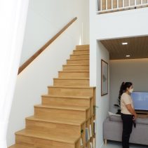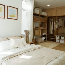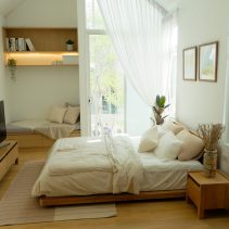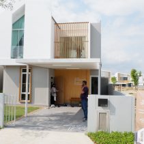 The houses are 128 sqm, start from 2.99 million baht and consist of 2 bedroom: 1 double with vaulted ceiling and 1 single – living room / kitchen – family bathroom + guest shower toilet. The unique feature is that the master bedroom has floor to ceiling 3.85 meters height.