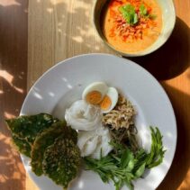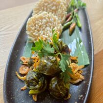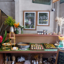 Examples from the menu: Sukjai Satay 165 THB / Jackfruit “Pork” Burger / Spicy Stir-fried “Catfish” / Stir-fried Jackfruit Basil / SUKJAI Traditional Thai Dishes Northern-style Spicy Larb / Thai Rice Noodles with Tomato Curry (Nam Ngiao) Chiang Mai Hang Lay Curry Royal-style Chilled Rice (Khao Chae) SUKJAI One-Dish Favorites Crispy Mushroom “Oyster Pancake” 130 THB / Banana Noodle Pad Thai 150 THB /Pink Noodle Soup (Yentafo) 130 THB / Mini Noodle Bowl (Guay Tiew Kae)