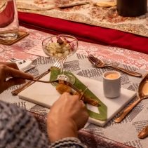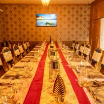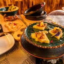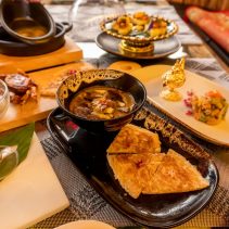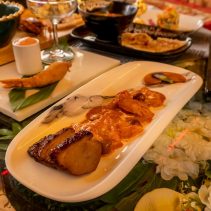 Examples from the menu include: Crunchy Pork with garlic and herbs, Ma Hore: pineapple and pork, Gaeng Nuer Prik Kii Nue Suan: beef curry with coconut milk and served with Roti, Gaeng Paet Paed Yang: duck curry with coconut milk, Watermelon and Yam served with salad sauce, Gaeng Paet Paed Yang: duck curry with coconut milk.