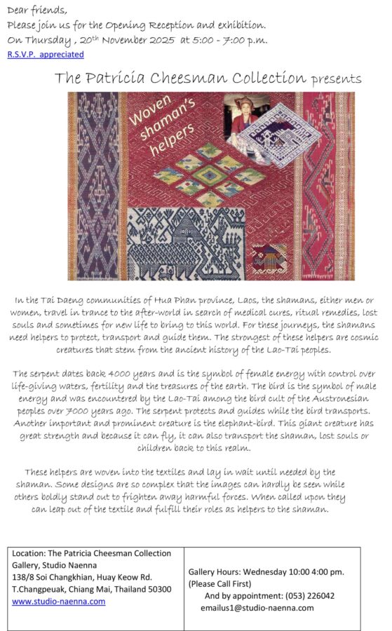 The Patricia Cheesman Collection presents :Woven Shaman’s Helpers an exhibition of Antique textiles. Location: The Patricia Cheesman Collection Gallery, Studio Naenna. 138/8 Soi Changkhian, Huay Keow Rd. T.Changpeuak, Chiang Mai, Thailand 50300