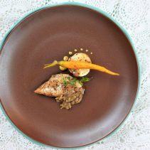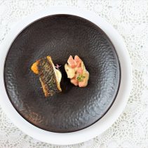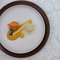 Flowers in a River: Seared Goby Fish, Butternut Puree, Mashed Cauliflower in Fresh Tomato & Chive Cream / Pinot Nero, Franz Haas, Italy 2017.