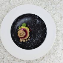 Scent of Rain: Foie Gras Terrine, Port Wine Duck Liver Mousse, Dofann Goat Cheese Stuffed Date, Baby Corn, Shallot Toddy Palm Confit & Rhubarb Jelly / Gewurtraminer, Alena Walch, Italy 2015.