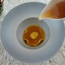 Cozy Rainy Evening: Heirloom Pumpkin Ravioli with Wild Mushroom & Dofann Ricotta Cheese, Almond-Shrimp Cigarette Spicy Creamy Pumpkin, Lemon Basil Caviar in Shrimp Consumme / Calpazio Greco Paestum, San Salvatore, Italy, 2015.