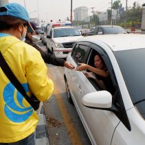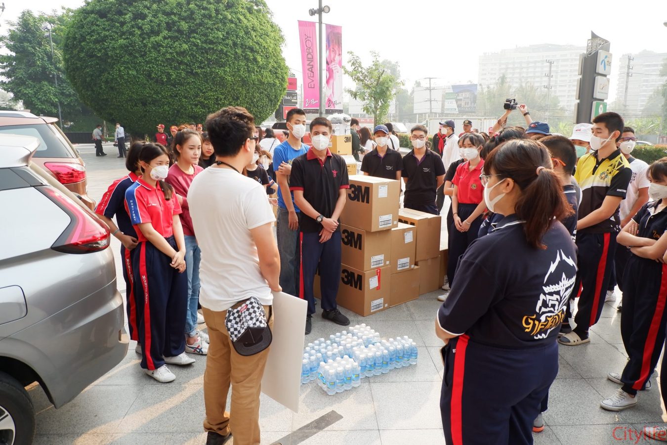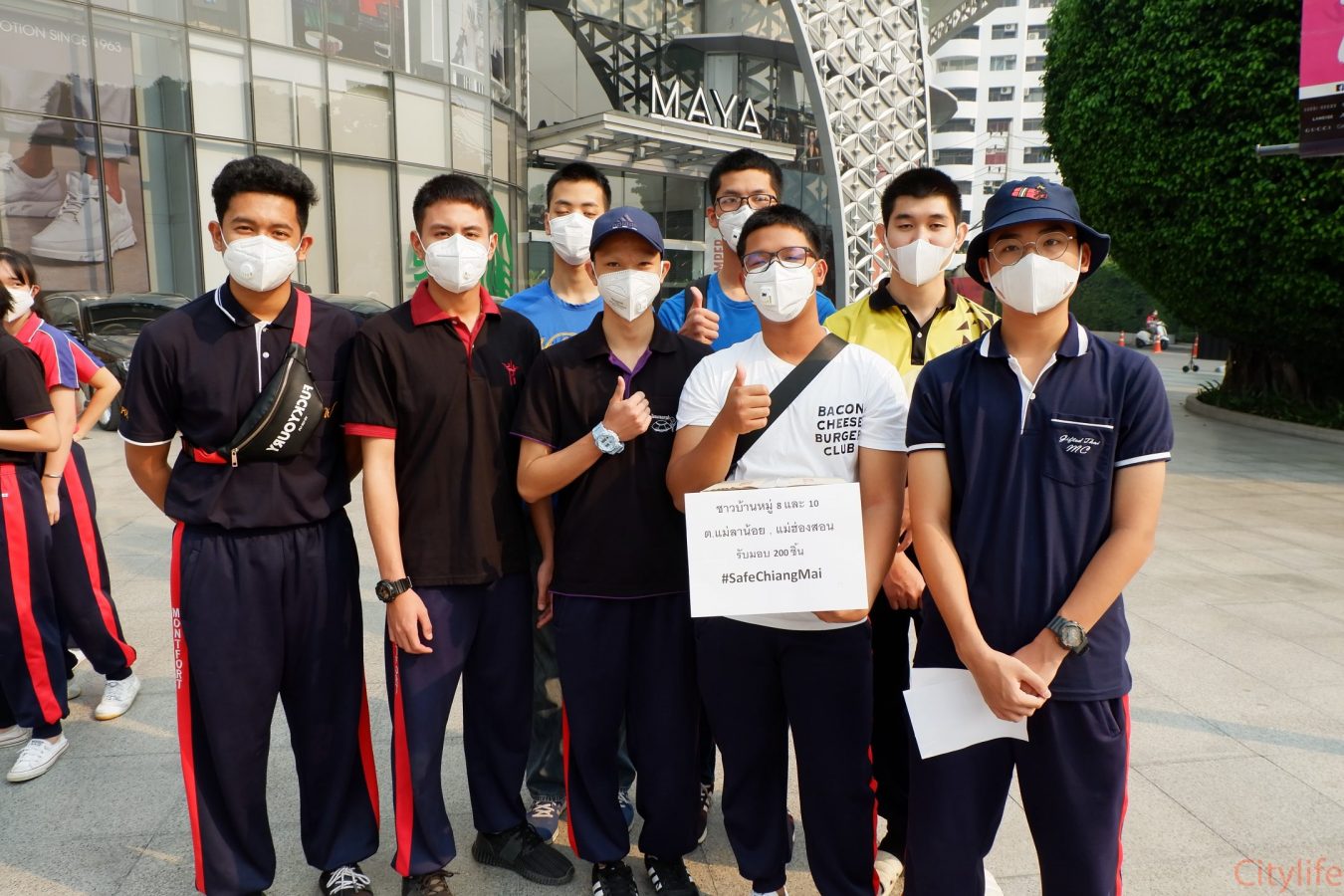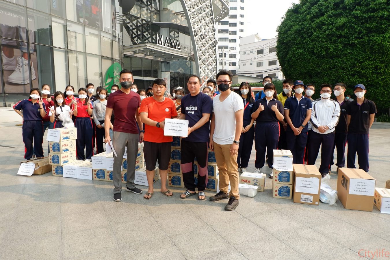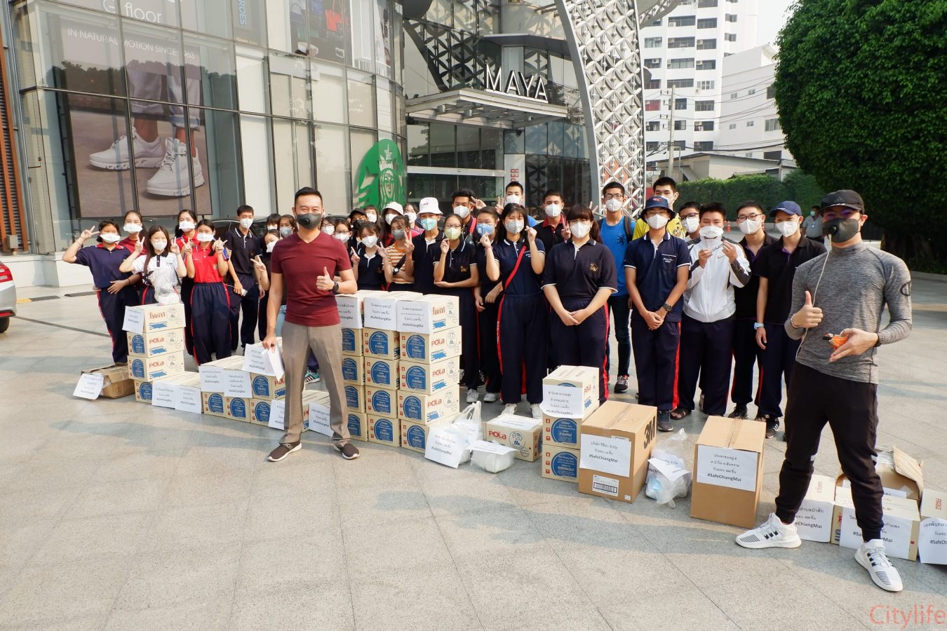 Safe Chiang Mai Group met at Maya Lifestyle Shopping Center to coordinate distributing over 60,000 face masks around Chiang Mai Province and Mae Hon Song to combat the effects of pollution. The group also handed out masks to people around the Rincome Intersection.