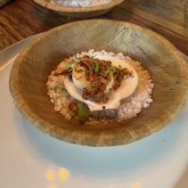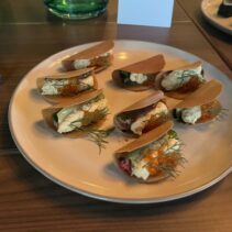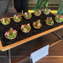 Oxygen: Edamame Baby Cos Salad Tart Topped with Ikura Salmon / L’elephant: Free Range Chicken Mousse | Cucumber I Roselle / Cuisine de Garden: Smørrebrød Charcoal Sourdough with Turmeric Pickled Fish / Meliá Chiang Mai Seared Scallop with Dripping Hot Sauce, Lemon and Turmeric Chips / Aquaria: Cold Corn Soup Shot with Khai Pam