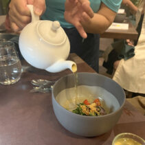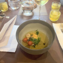 Soup : Meliá Chiang Mai: Consommé with Bagrid Catfish Crumbles, Organic Greens, Cherry Tomatoes, Shallots and Seasonal Mushrooms (Tea: Preserve – hand roasted green tea)