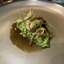Main: Blackitch Barley Risotto with Chaya Kale serve wirh Chicken Roulade and Dry Mountain Vegetables (Tea: Khao Doi)
