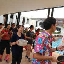 Anantara Chiang Mai celebrated Songkran in a traditional fun way. The management, staff and guests enjoyed the Songkran festivities in the resort throughout the day. Guests are invited to participate and observe the Song Nam Phra or Buddha Image Bathing in the lobby area. Then the water fight took place in front of the resort with members of staff and guests joining the fun fare to beat the heat of a summer day. Later in late afternoon, guests were invited to join and watch the long drum parade from the lobby to the pool lawn, followed by the circle dance. Rod Nam Dam Hua or Water blessing of the senior management took place by the pool, and the day ended with fun Thai games such as sack sun, cucumber golfing and tug of war.