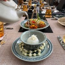 Prior to the cocktail party there was the Cooling Khao Chae Delicacy Experience,(from 1 – 30 April 2023) especially for the upcoming Songkran 2023: a Thai summer favourite of chilled rice in jasmine water, served with traditional sides. Vegetable delights of fingeroot, champaka flower, cucumber, green mango, spring onion and chili, paired with hand-crafted condiments of fried shrimp paste, stuffed sweet peppers in a crisp & lacy egg wrap, dried pickled radishes and shredded caramelized pork. 390 THB ++ per person / 690 THB ++ per couple.