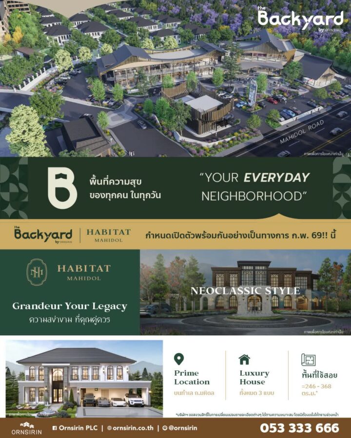 Chiang Mai, 6 December 2025 — Ornsirin Group, a long-established local real estate developer, continues to leverage its land potential and strong customer traffic to elevate Chiang Mai’s urban landscape with a new integrated development on Mahidol Road — one of the city’s most promising districts. Catering to both lifestyle seekers and home-buyers, the company unveils two major projects: THE BACKYARD MAHIDOL, a new community mall designed around the concept of a true “Neighborhood Mall,” and HABITAT MAHIDOL, an A-List luxury residential project that connects every aspect of modern living. Both developments are set for an official launch in February 2026.
