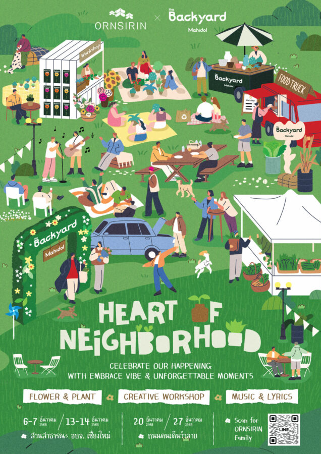 As part of its opening campaign, THE BACKYARD MAHIDOL is hosting a series of On-Ground Activities under the theme “Heart of Neighborhood”, fostering a lasting sense of community under the Ornsirin Family identity. Highlights include giveaways of special flower collections and unique tote bags, as well as complimentary art workshops throughout December 2025 for Ornsirin residents and Millhill School students. Activities will take place in a lively garden setting where families can gather — spanning Suan O.B.J. Public Park and the Wua Lai Walking Street — from 16:00 to 19:00 on rotating dates: