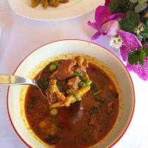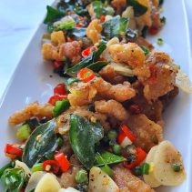 Stir fried wild boar with herbs and red curry paste 149 THB