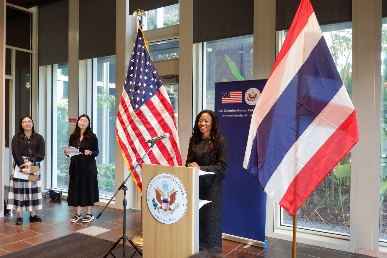 Consul General to Chiang Mai Kelia Cummins held a press conference prior to the Decication Ceremony. She explained the new offices serves every year more than 21000 U.S. Residents living in the northern region of Thailand, along with Thai citizens seeking consulate services including visas. With the new building these services can be provided more safely, efficiently and effectively. The new Consulate General in Chiang Mai provides greater opportunity to collaborate with local businesses, universities and entrepreneurs to do things like foster trade and to develop innovation and technology.