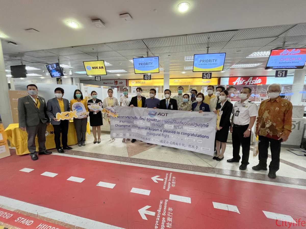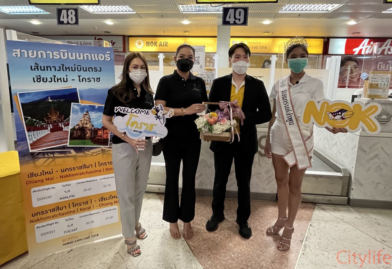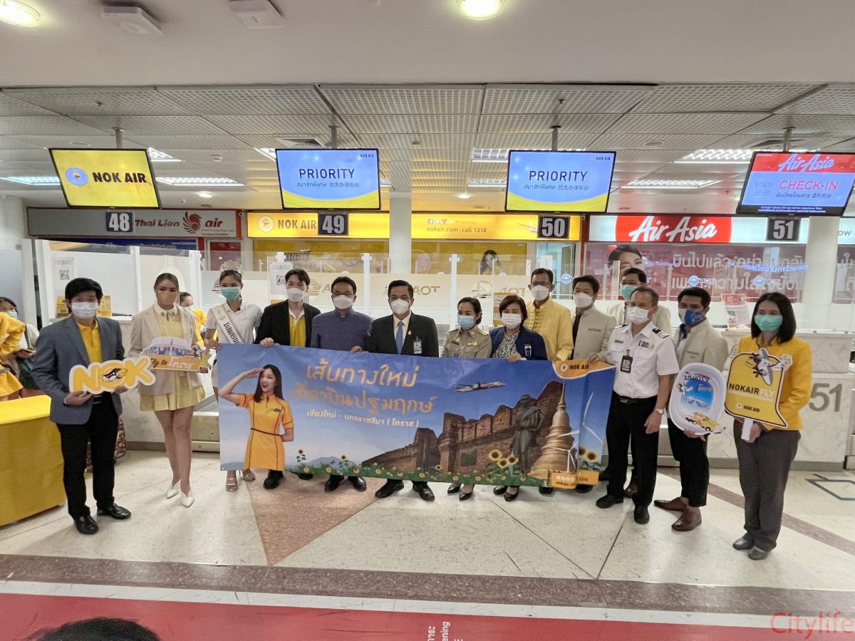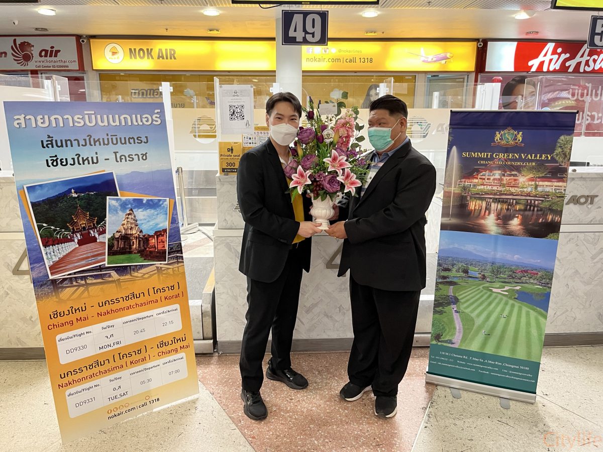 Following a Water Salute for NokAir Inaugural Flight Nakorn Ratchasima to Chiang Mai, the Deputy Governor of Chiang Mai, Vorayan Bunarat welcomed passengers from the flight DD751 at Chiang Mai Airport. The previous evening distinguished guests took the reverse flight Chiang Mai (CNX) and Nakorn Ratchasima (NAK).