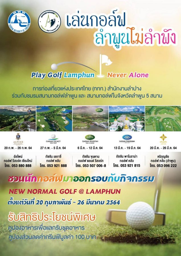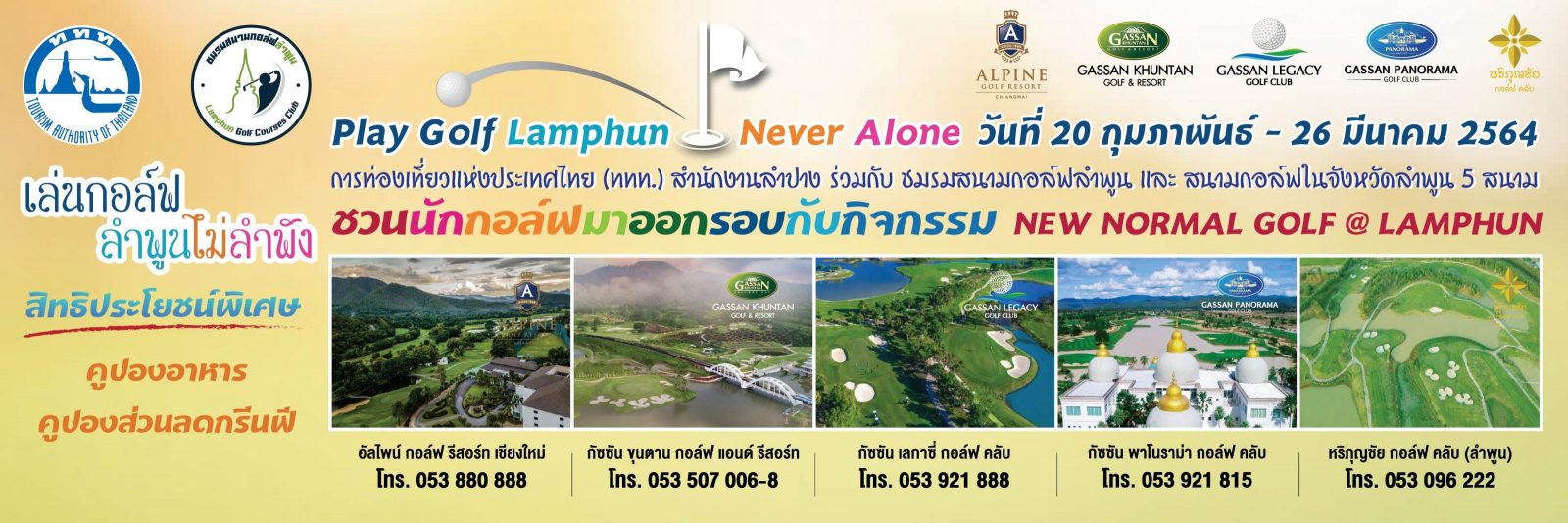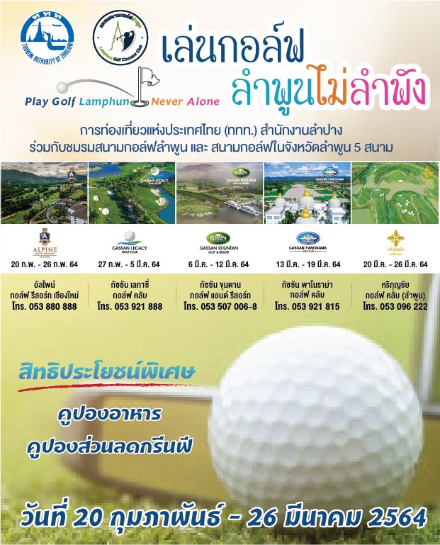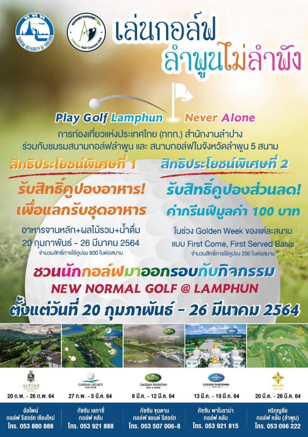 ดังนั้น การท่องเที่ยวแห่งประเทศไทย (ททท.) สำนักงานลำปาง จึงได้ร่วมกับ ชมรมสนามกอล์ฟลำพูน ประกอบด้วย สนามกอล์ฟ 5 สนามในจังหวัดลำพูน คือ สนามกอล์ฟอัลไพน์ กอล์ฟ รีสอร์ท, สนามกอล์ฟกัซซัน ขุนตาน กอล์ฟ แอนด์ รีสอร์ท, สนามกอล์ฟกัซซัน เลกาซี่ กอล์ฟ คลับ, สนามกอล์ฟกัซซัน พาโนราม่า กอล์ฟ คลับ และ สนามกอล์ฟหริภุญชัย กอล์ฟ คลับ จัดโครงการกระตุ้นและส่งเสริมการท่องเที่ยวจังหวัดลำพูนด้วยกิจกรรม เล่นกอล์ฟ ในชื่อกิจกรรม “เล่นกอล์ฟ ลำพูนไม่ลำพัง” ภายใต้โครงการ Lamphun Golf and Sports Tourism ระหว่างวันที่ 20 กุมภาพันธ์ – 26 มีนาคม 2564 โดยมอบสิทธิประโยชน์ให้นักกอล์ฟที่ร่วมกิจกรรม ดังนี้