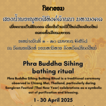 The annual traditional Buddha Sihing bathing ritual will be held at Wat Phra Singh, though the tradition this year will be starting at 7.30am on 1st April at Three Kings Monument. Between the 1st-12th April everyone is invited to pour water over a copy of the famed statue at Wat Phra Singh temple. The 13th will see the original statue paraded through the city and the 14th-15th all are invited to pour water on the original statue back at the temple. The statue returns to its home inside the temple on the 16th and a copy will be on display infront of the vihara until the end of the month.