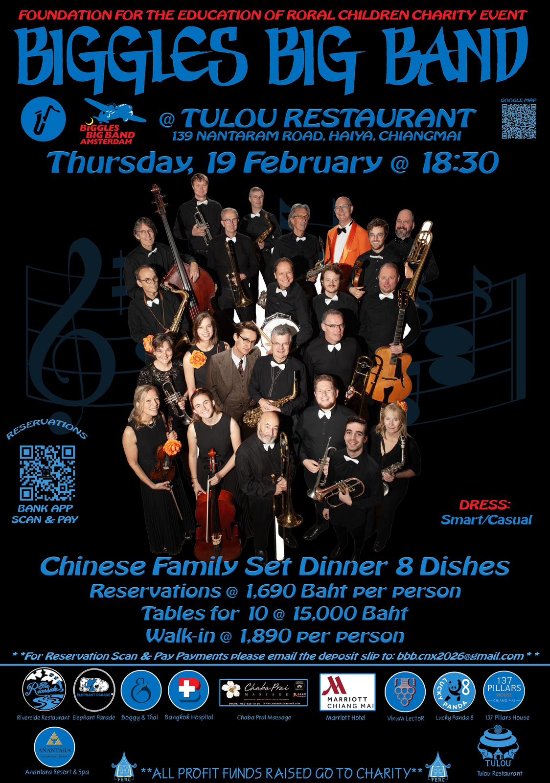 Guests will enjoy two live sets by the Biggles Big Band, along with a specially curated Chinese dinner featuring eight exquisite dishes. The evening promises fantastic music, a lively atmosphere, and plenty of opportunities for dancing.