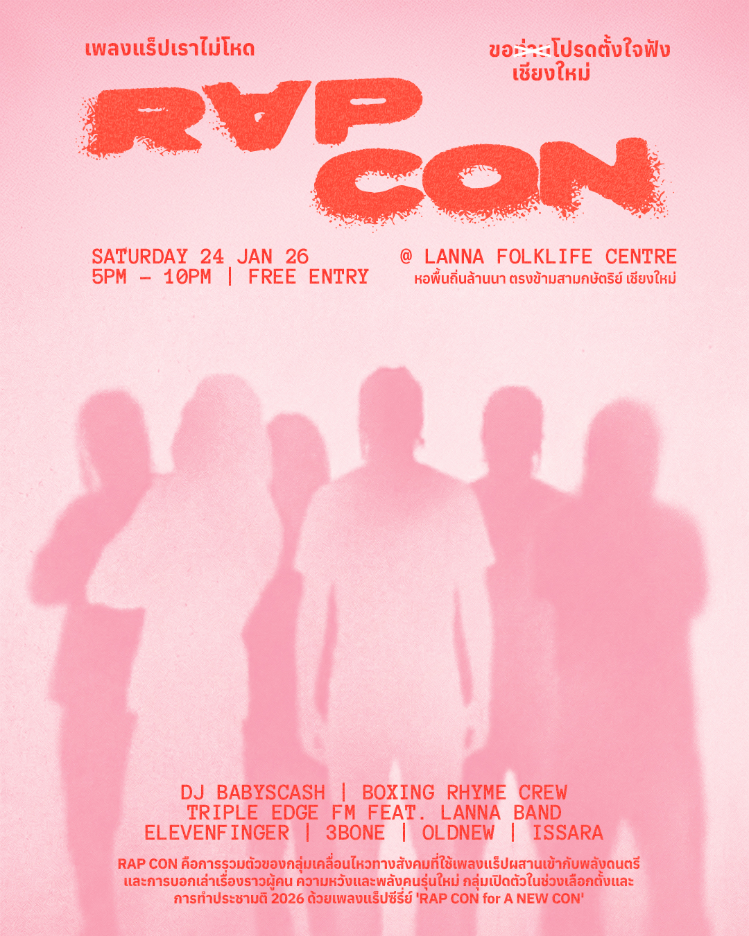 R∀P CON is a socially driven cultural event that brings together rappers, DJs, and local artists from Chiang Mai, Bangkok, and other regions. The event highlights storytelling through hip-hop, using music as a platform to reflect everyday life, social experiences, and authentic voices from the community.