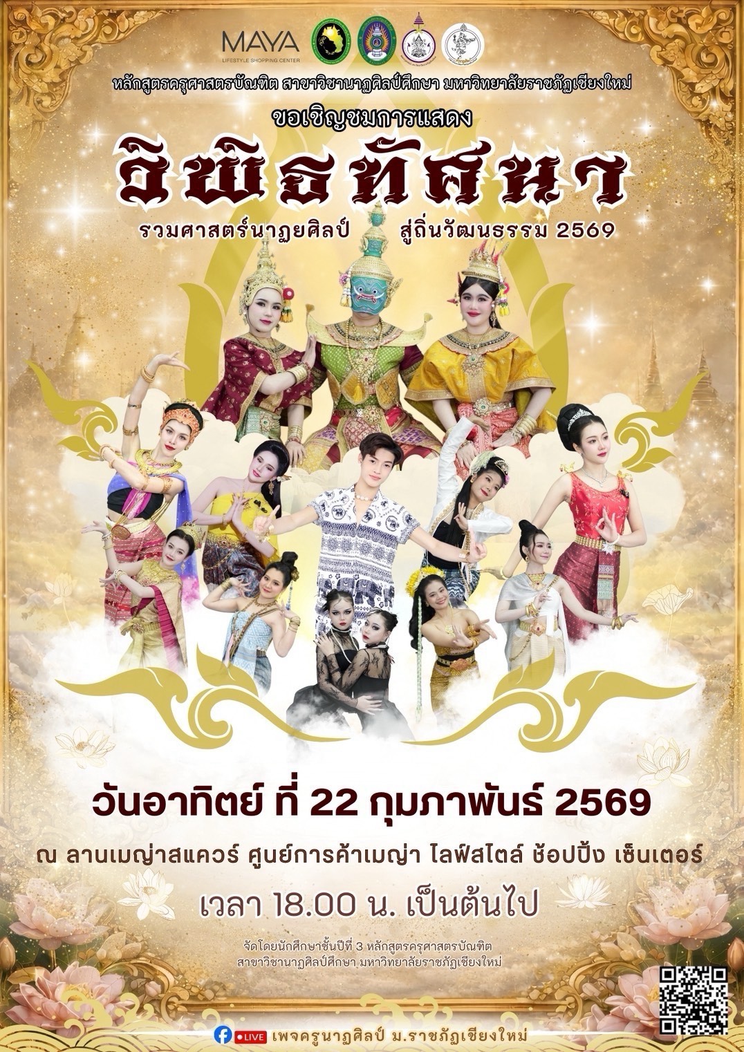 MAYA Lifestyle Shopping Center, in collaboration with the Faculty of Humanities and Social Sciences, Chiang Mai Rajabhat University, proudly presents “Wipittatsana: A Confluence of Dramatic Arts Toward Cultural Heritage 2026.” The event aims to preserve and promote the elegance of Thai classical dance and dramatic arts — refined forms of theatrical and dance expressions meticulously created by humankind. Through graceful movements inspired by nature, harmoniously blended with music and vocal performance, these treasured art forms continue to be passed on sustainably to future generations.
