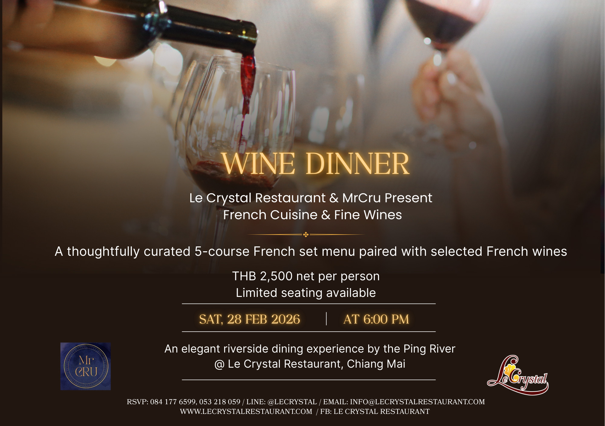 Le Crystal Restaurant, in collaboration with MrCru, cordially invites you to an elegant riverside Wine Dinner by the Ping River.