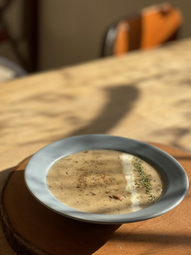 we use seasonal fresh botton and shiitake mushroom for this soup with local produced cream and gruyere cheese with a little bit of vinegar to bring our natural umami taste served with our homemade bread.
