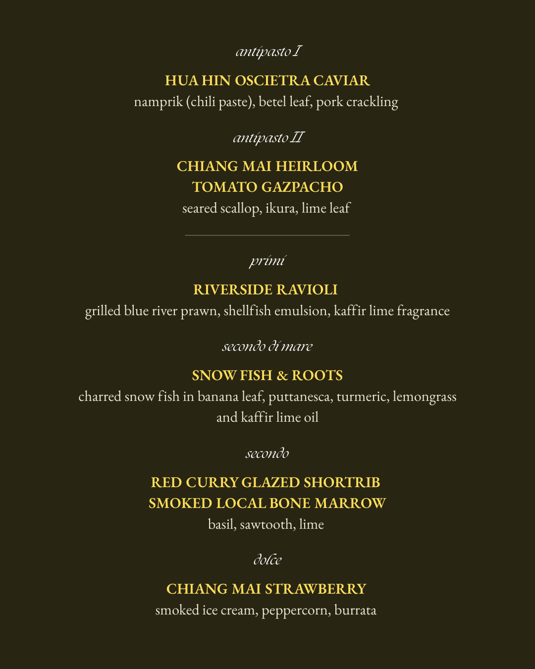 For the Secondo di Mare, enjoy Charred Snow Fish wrapped in banana leaf with a vibrant puttanesca twist of turmeric and lemongrass. The meat course, Secondo, features Red Curry Glazed Short Rib accompanied by local smoked bone marrow, a dish designed to redefine comfort and indulgence.