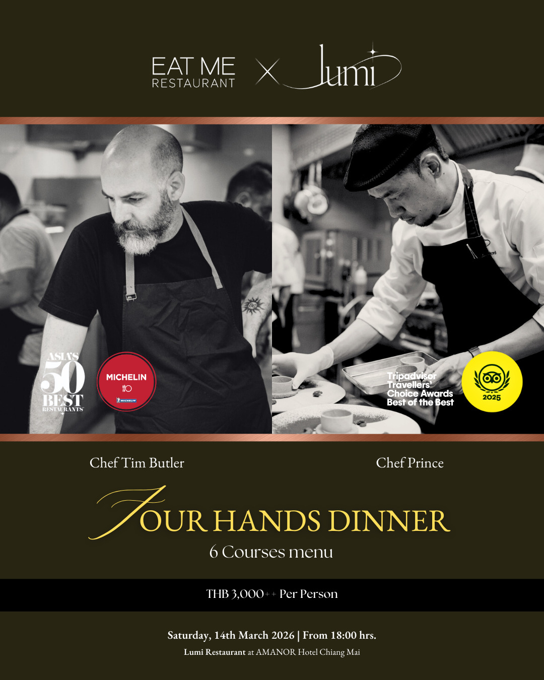 Chiang Mai’s culinary scene is about to reach a new crescendo. On March 14th, Lumi Restaurant welcomes Chef Tim Butler the visionary behind Bangkok’s legendary Eat Me (Asia’s 50 Best #25, Michelin Plate) for an exclusive four-hands collaboration with our very own Chef Prince.