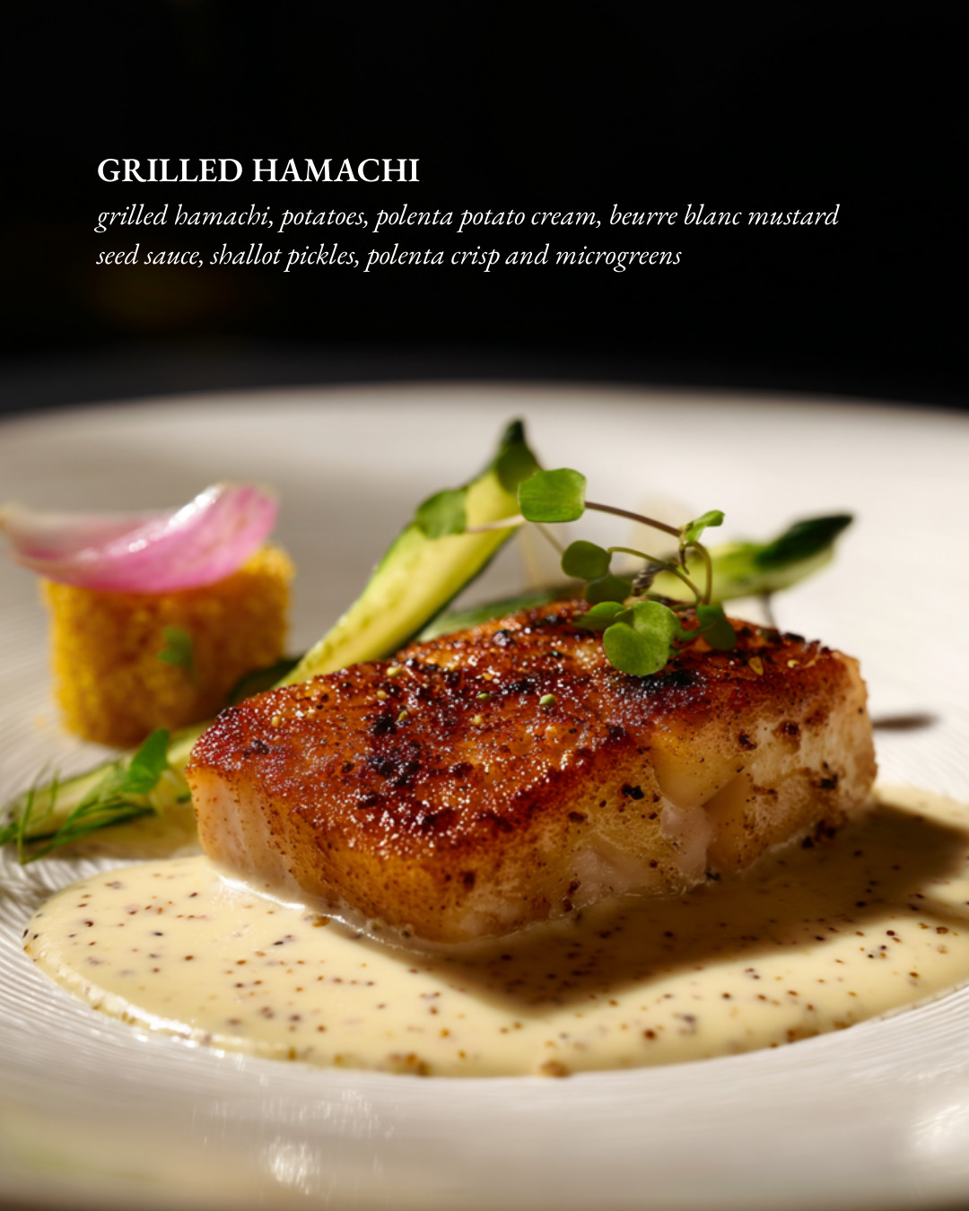 ‘Ti Amo’ (I Love You) : The declaration, you choose: 𝐀𝐮𝐬𝐭𝐫𝐚𝐥𝐢𝐚𝐧 𝐖𝐚𝐠𝐲𝐮 𝐫𝐢𝐛 𝐞𝐲𝐞 mb 4-5 from southern stations, australia, porcini red wine sauce, cream cheese mashed potato on a laminated pastry, or 𝐠𝐫𝐢𝐥𝐥𝐞𝐝 𝐇𝐚𝐦𝐚𝐜𝐡𝐢, Grilled Hamachi with, Polenta and Potato Cream, Beurre Blanc Mustard Seed Sauce, Shallot Pickles, Polenta Crisp, and Microgreens.
