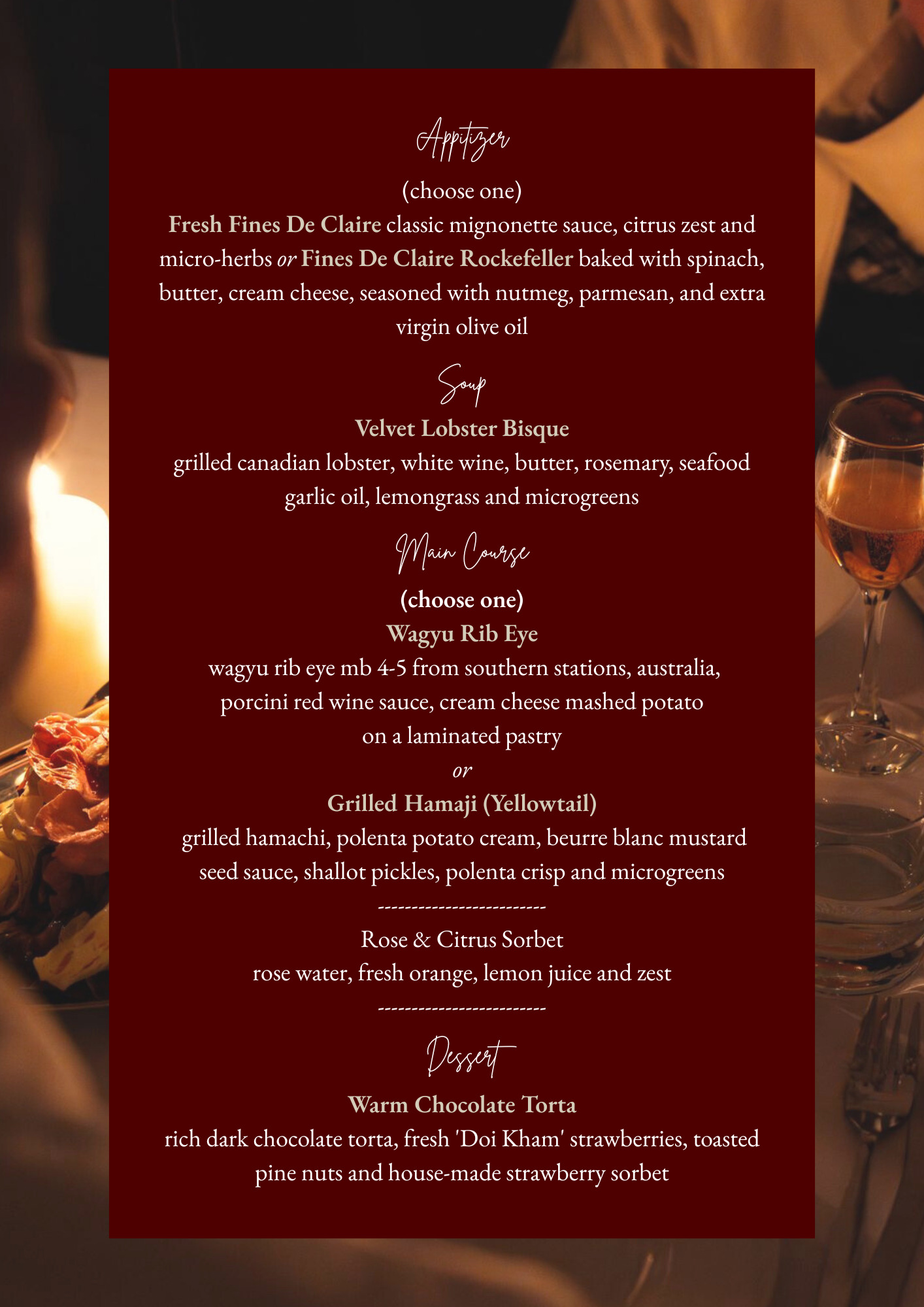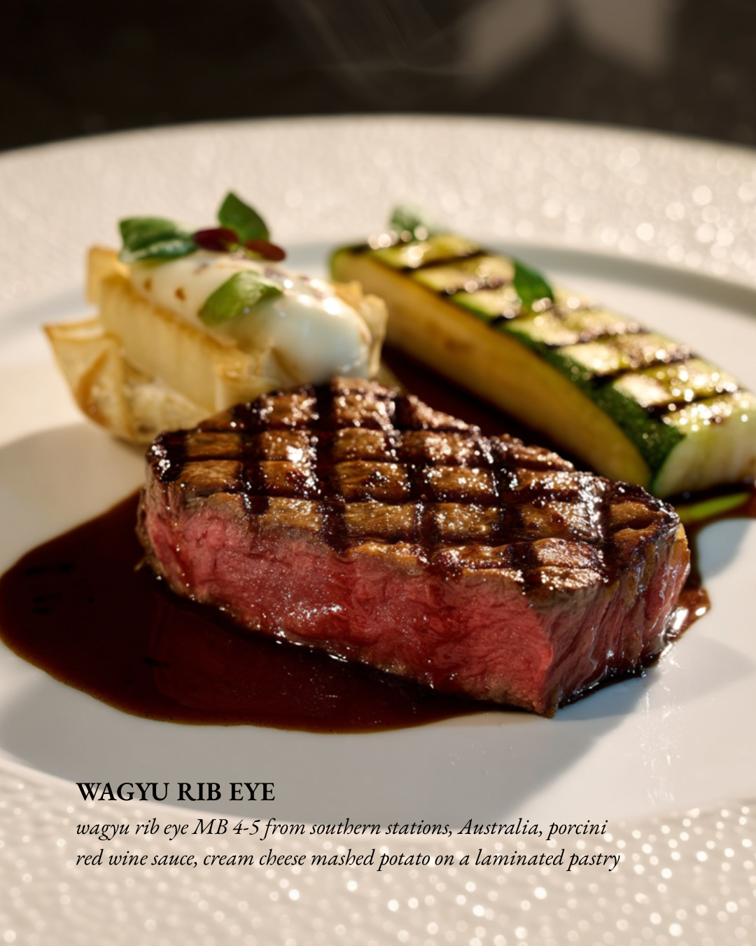 ‘Ti Amo’ (I Love You) : The declaration, you choose: 𝐀𝐮𝐬𝐭𝐫𝐚𝐥𝐢𝐚𝐧 𝐖𝐚𝐠𝐲𝐮 𝐫𝐢𝐛 𝐞𝐲𝐞 mb 4-5 from southern stations, australia, porcini red wine sauce, cream cheese mashed potato on a laminated pastry, or 𝐠𝐫𝐢𝐥𝐥𝐞𝐝 𝐇𝐚𝐦𝐚𝐜𝐡𝐢, Grilled Hamachi with, Polenta and Potato Cream, Beurre Blanc Mustard Seed Sauce, Shallot Pickles, Polenta Crisp, and Microgreens.