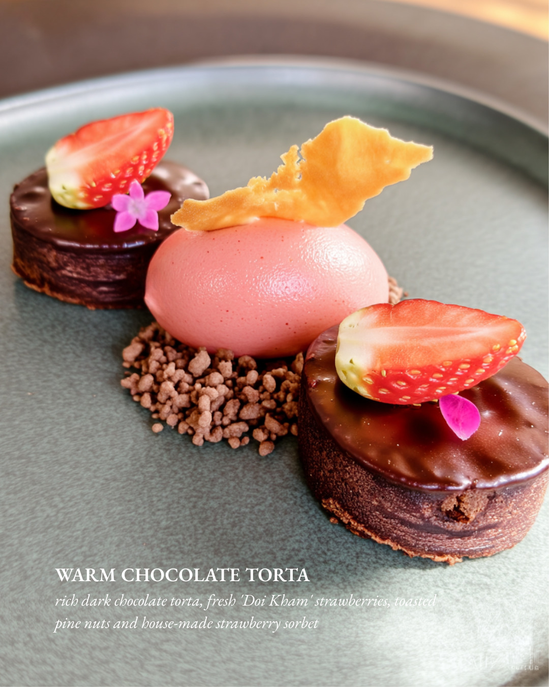 ‘Per Sempre’ (Forever) : Warm 𝐂𝐡𝐨𝐜𝐨𝐥𝐚𝐭𝐞 𝐓𝐨𝐫𝐭𝐚 rich dark chocolate torta, fresh ‘Doi Kham’ strawberries, toasted pine nuts and house-made strawberry sorbet