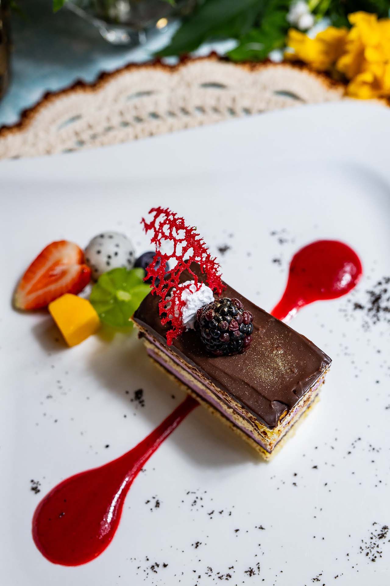 End the evening on a sweet note with your choice of Dessert — Paris Brest with Pistachio and Orange Cream or Blackberry Opera Torte.