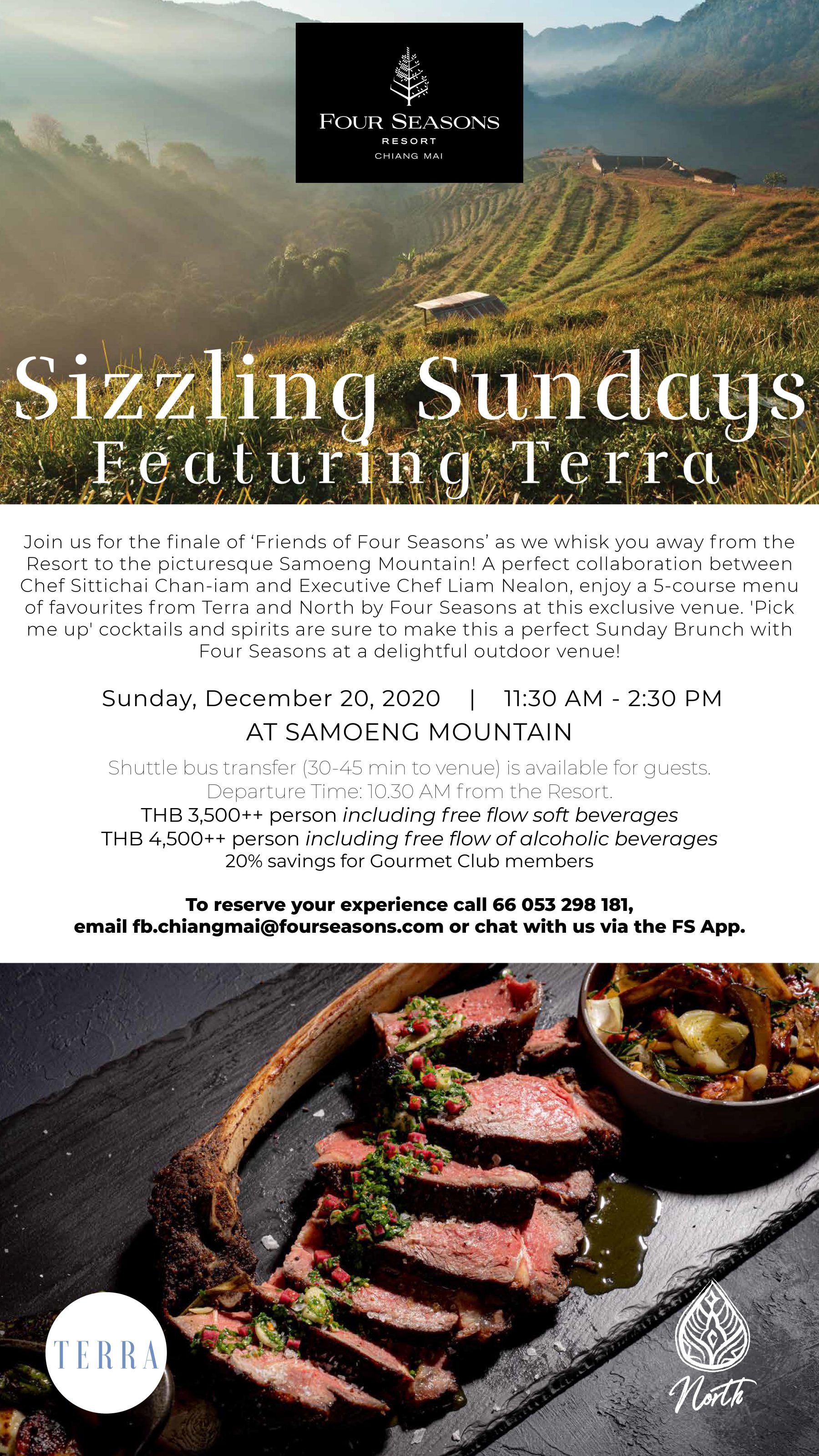 Join us for the finale of ‘Friends of Four Seasons’ as we whisk you away from the Resort to the picturesque Samoeng Mountain! A perfect collaboration between Chef Sittichai Chan-iam and Executive Chef Liam Nealon, enjoy a 5-course menu of favourites from Terra and North by Four Seasons at this exclusive venue. ‘Pick me up’ cocktails and spirits are sure to make this a perfect Sunday Brunch with Four Seasons at a delightful outdoor venue!