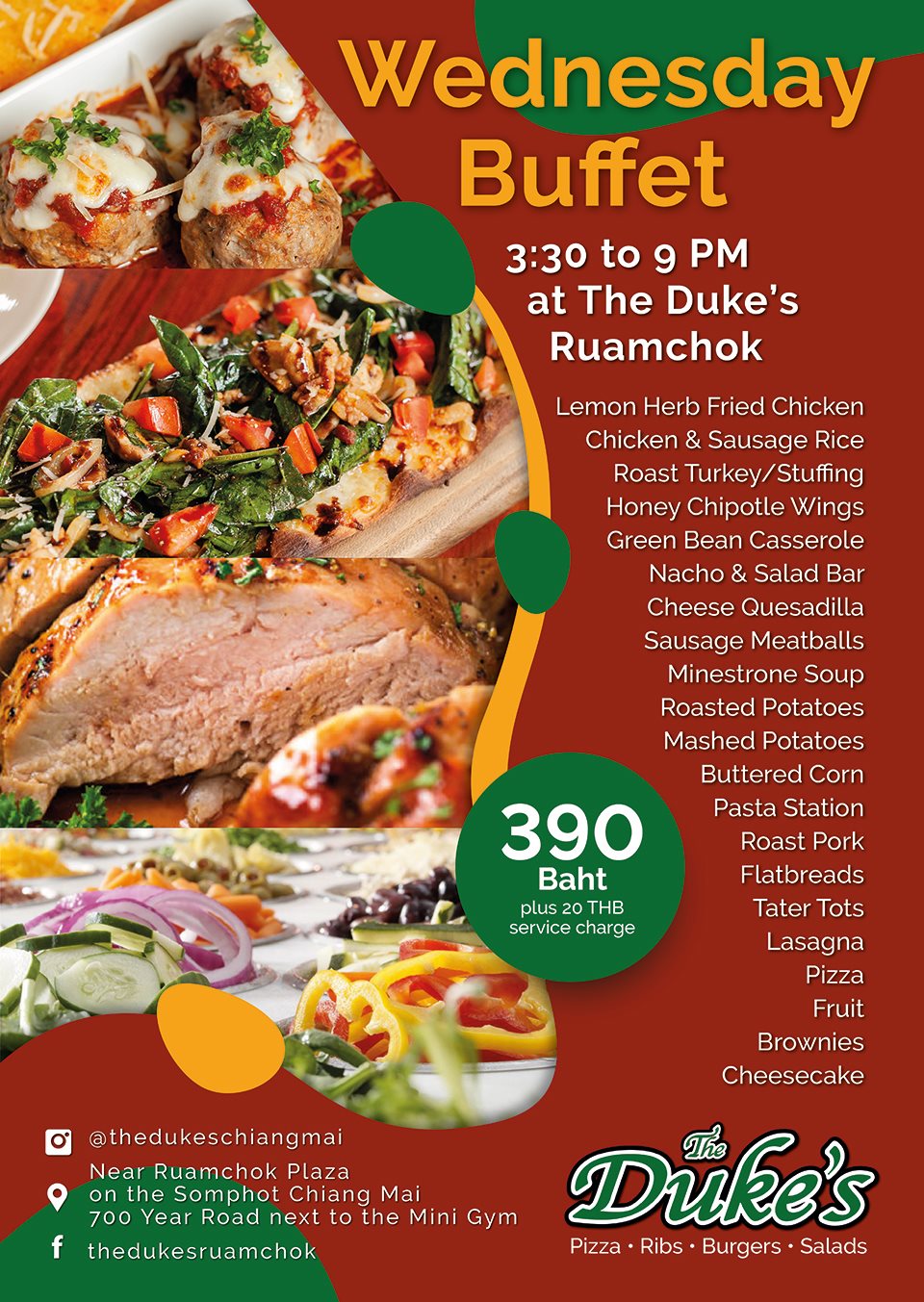 Buffet includes lemon herb fried chicken / chicken & sausage rice / roast turkey with stuffing / honey chipotle wings / green bean casserole / nacho & salad bar / cheese quesadilla / sausage meatballs / minestrone soup / roast potatoes / mash potatoes / pasta station / pizza and much