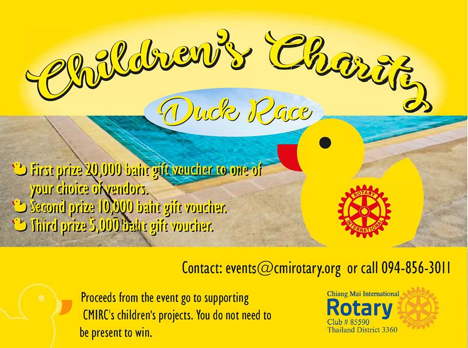 The Children’s Charity Duck Race is a FUNdraising event organized by the Chiang Mai International Rotary Club. Proceeds from the programme go to support CMIRC’s various children’s charity projects, centered around child safety, health, and education.