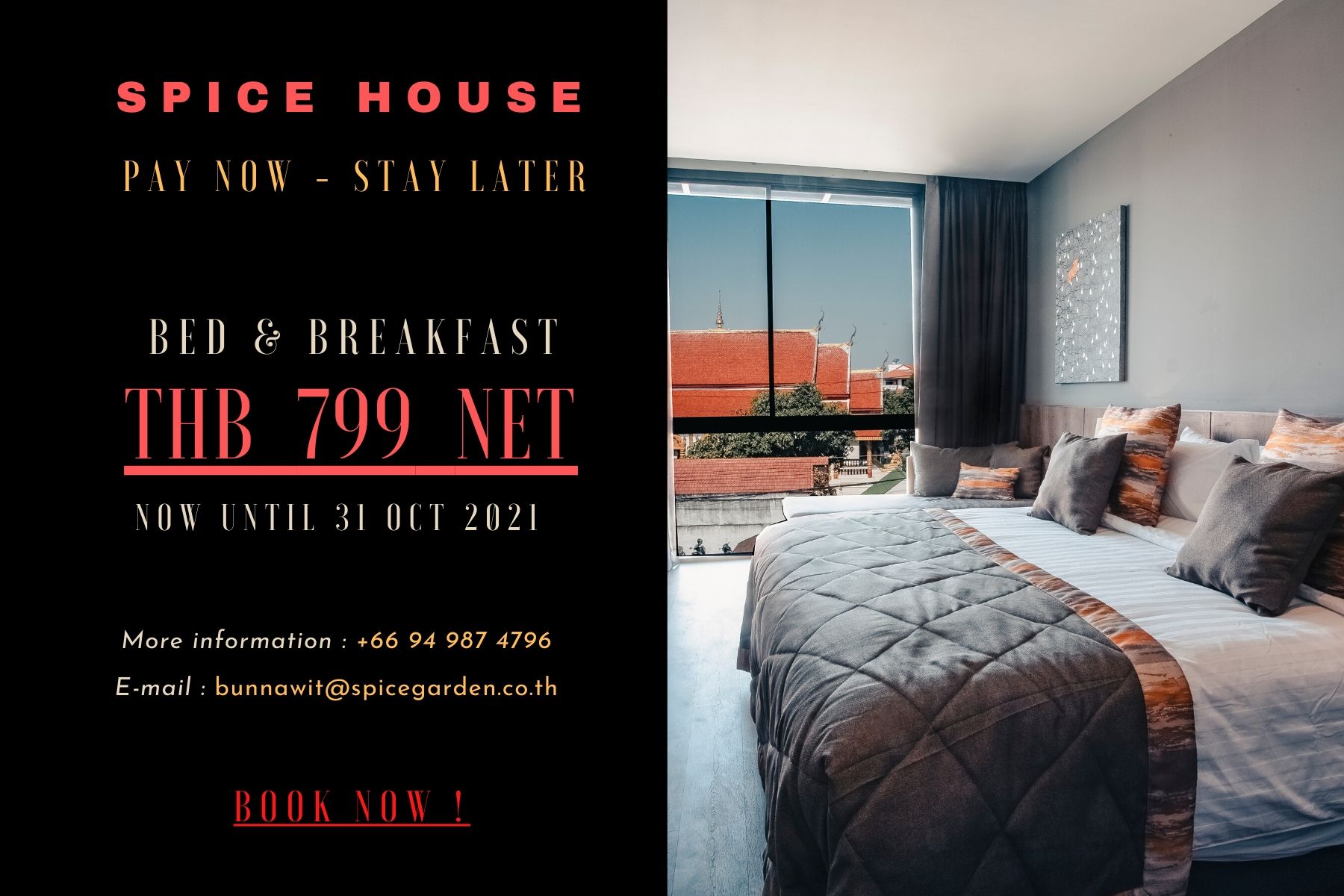 Pay Now Stay later, room with breakfast only THB 799 net