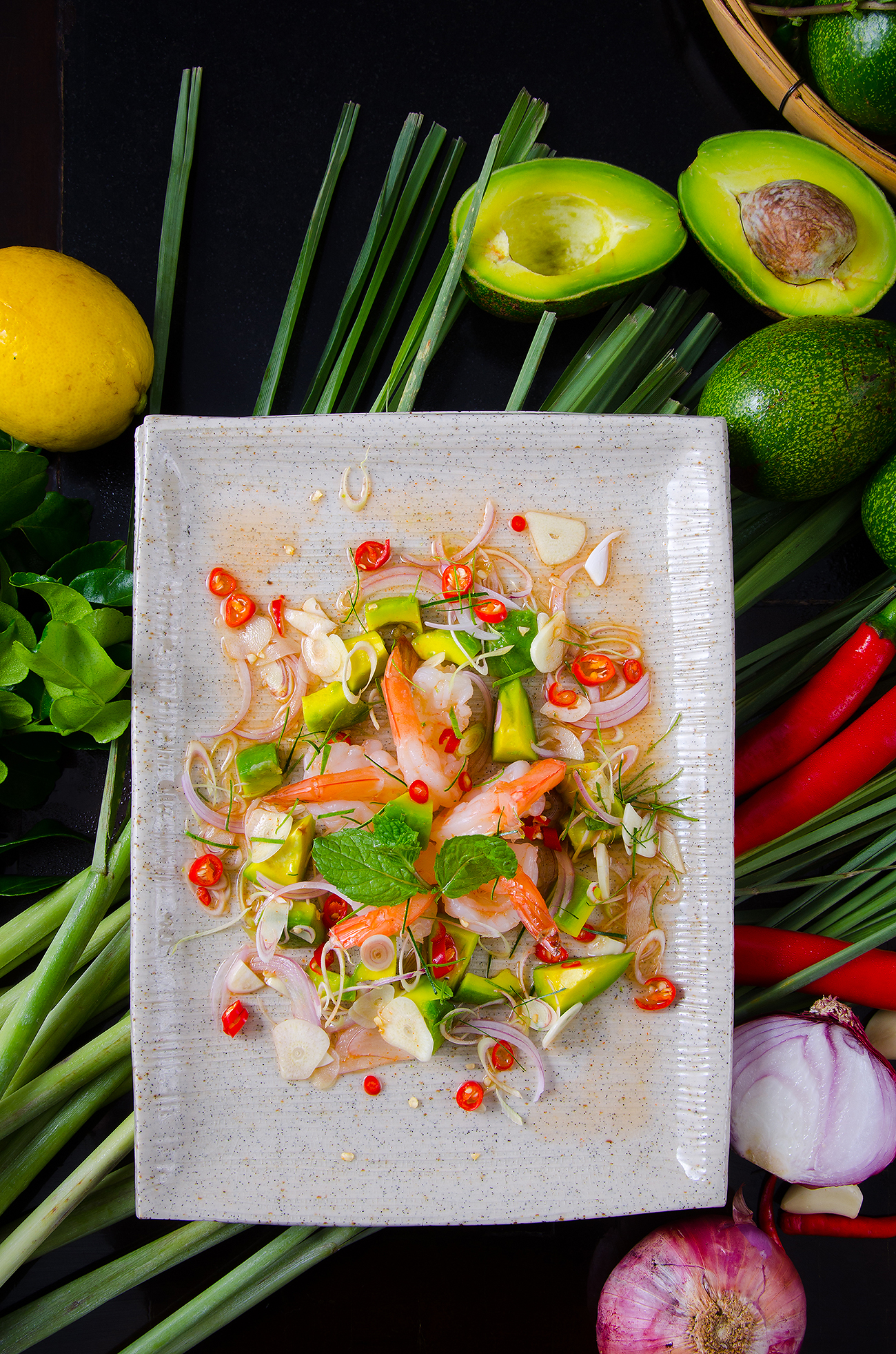 Chef Sakorn Deeying of Holiday Inn Chiang Mai picked the popular avocado out of a hat as the main ingredient for this anniversary issue’s creative challenge, and he has not disappointed! He has created a classic Thai dish, the yum, or spicy salad, infused with all the herbs and spices we know and love, but using avocado as its main ingredient alongside prawns.