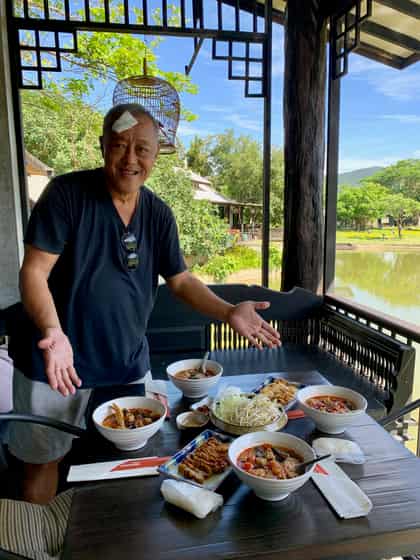 “I fried three-storey pork in fish sauce,” he grins as he presented us with a crispy and simply spectacular streaky pork bite accompanied by steaming hot sticky rice. “And here is kanomjeen nam ngiew noodles which is going to blow you away.” It did.