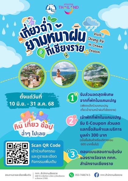 From June 10 to August 31, 2025, TAT Chiang Rai Office invites visitors to join the “Amazing Chiang Rai in Green Season” campaign and enjoy two exclusive benefits when staying at participating hotels: